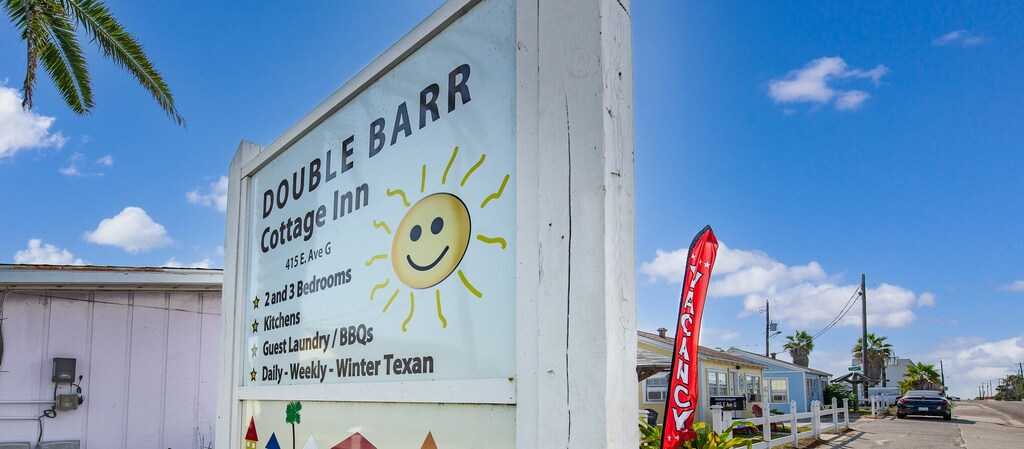 Welcome to the iconic Double Barr Cottages! Double Barr has been a favorite of Port A visitors for generations and is perfect for a quick beach getaway, a fishing trip, or family fun. Located just a couple of blocks from the beach in the "golf cart zone", you can walk, bike, or take a cart to the beach, fishing, or the many shops, restaurants, and other attractions downtown. The property has free parking, outdoor dining areas, and gas BBQ grills. An on-site laundry is available for a small fee.