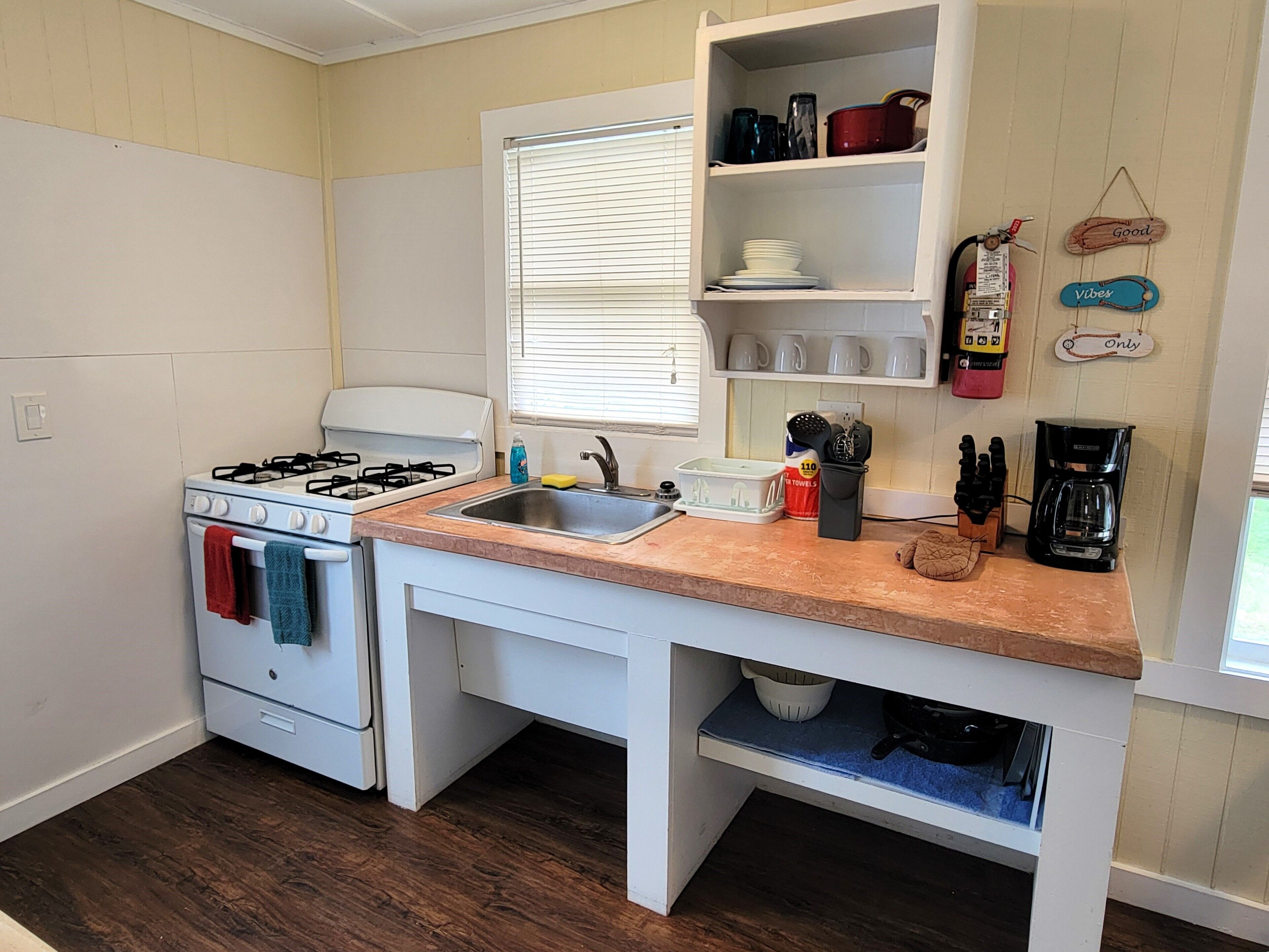 The kitchen has a retro vibe that will take you back to the Port A's historic past and includes a refrigerator/freezer, gas stove, microwave, a coffee station, and all of the kitchen basics. While we supply pots, pans, dishes and utensils, we do not supply any reusable basics such a oil, spices, or condiments for safety concerns.