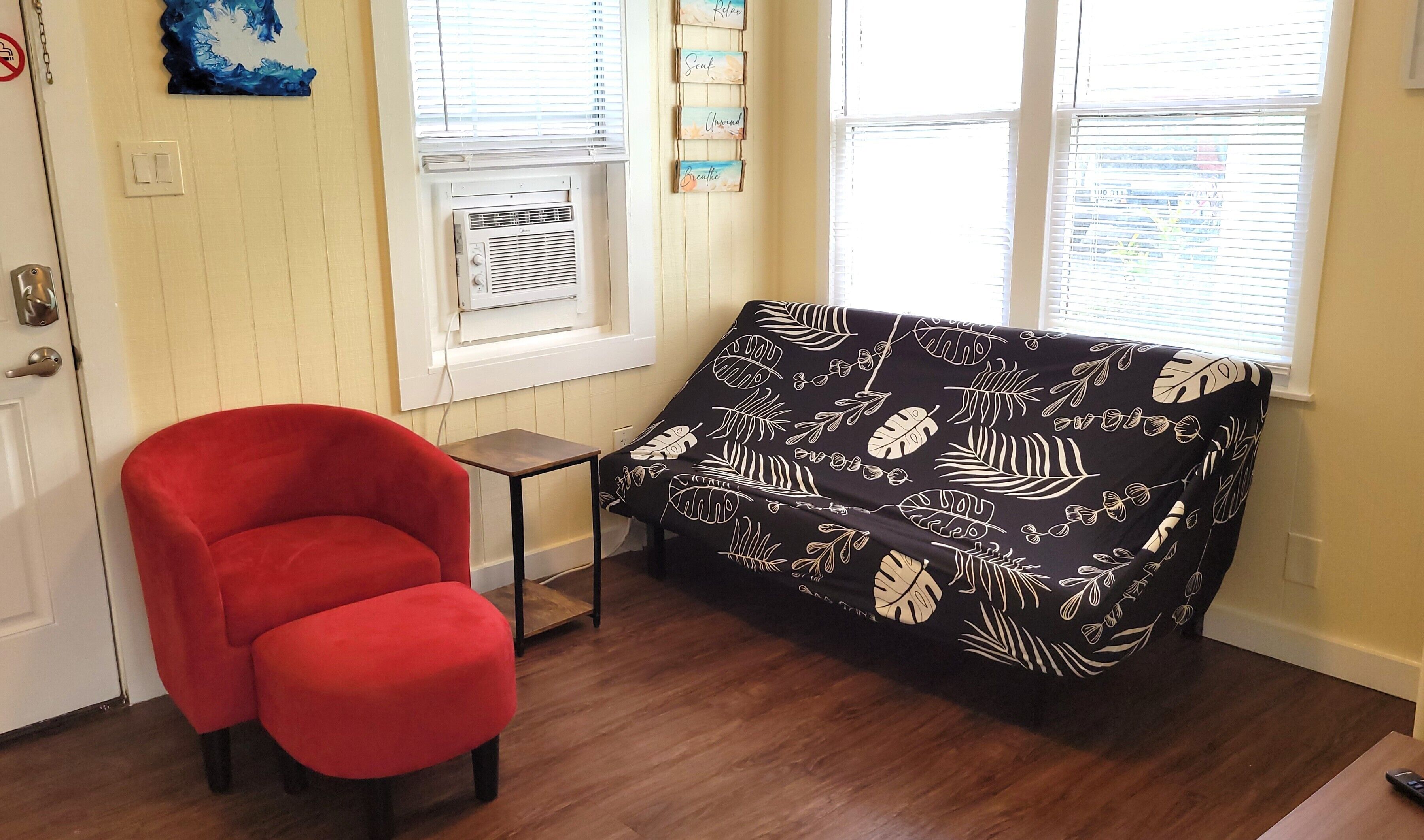 Low Tide now has a separate living area with a sleeper sofa, a coffee table, and additional seating to give you a place to relax and catch a movie after a day at the beach. Whether you're in town for a weekend or several weeks, the living room gives you a comfortable space to watch television, play a game, or read. The couch folds out into a full sized bed to sleep 2 small adults or children. A smart television and wireless internet are included.