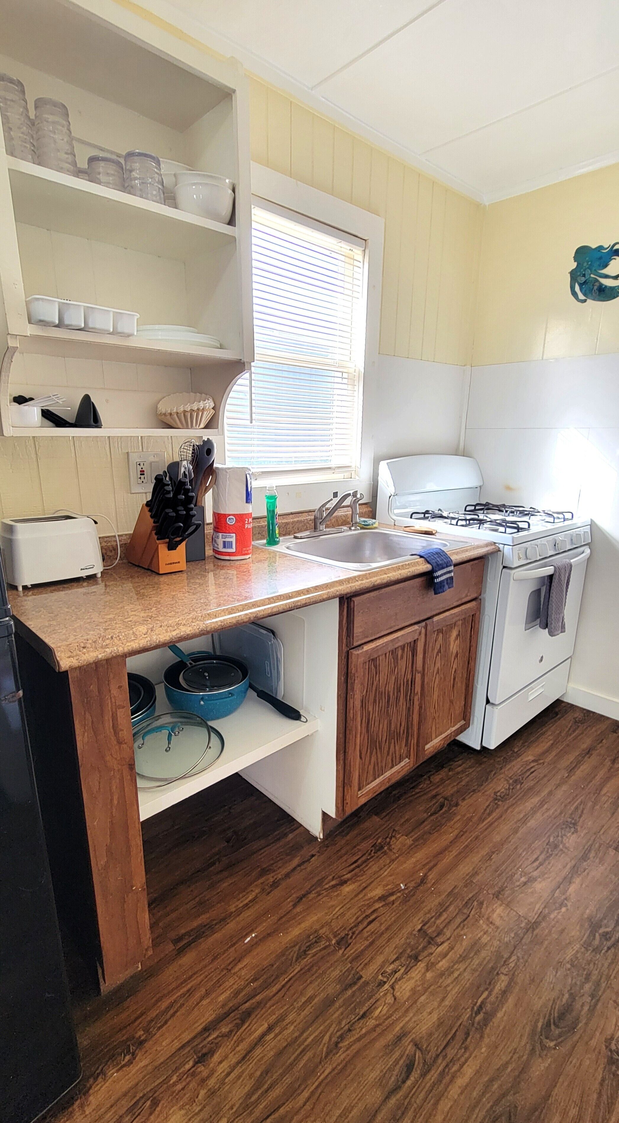 Cottage #8 (Low Tide) has been recently updated with a new configuration and new furnishings. When you enter, you'll find a kitchenette and a dining area that seats four. The main room has a retro vibe that will take you back to the Port A's historic past. The kitchen includes a refrigerator/freezer, gas stove, microwave, a coffee station, and all of the kitchen basics. While we supply pots, pans, dishes and utensils, we do not supply any reusable basics such a oil, spices, or condiments for safety concerns.