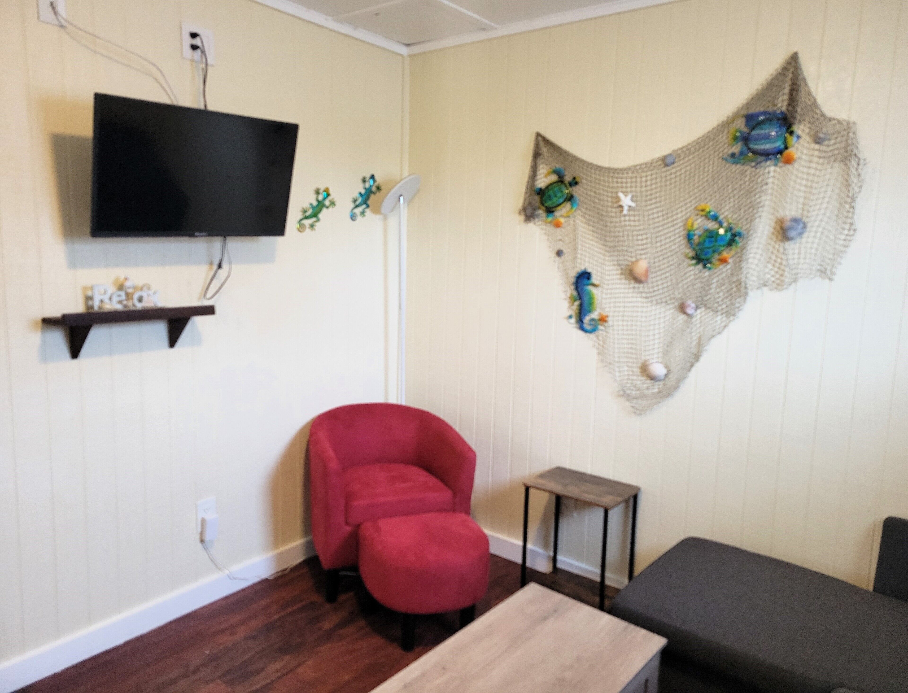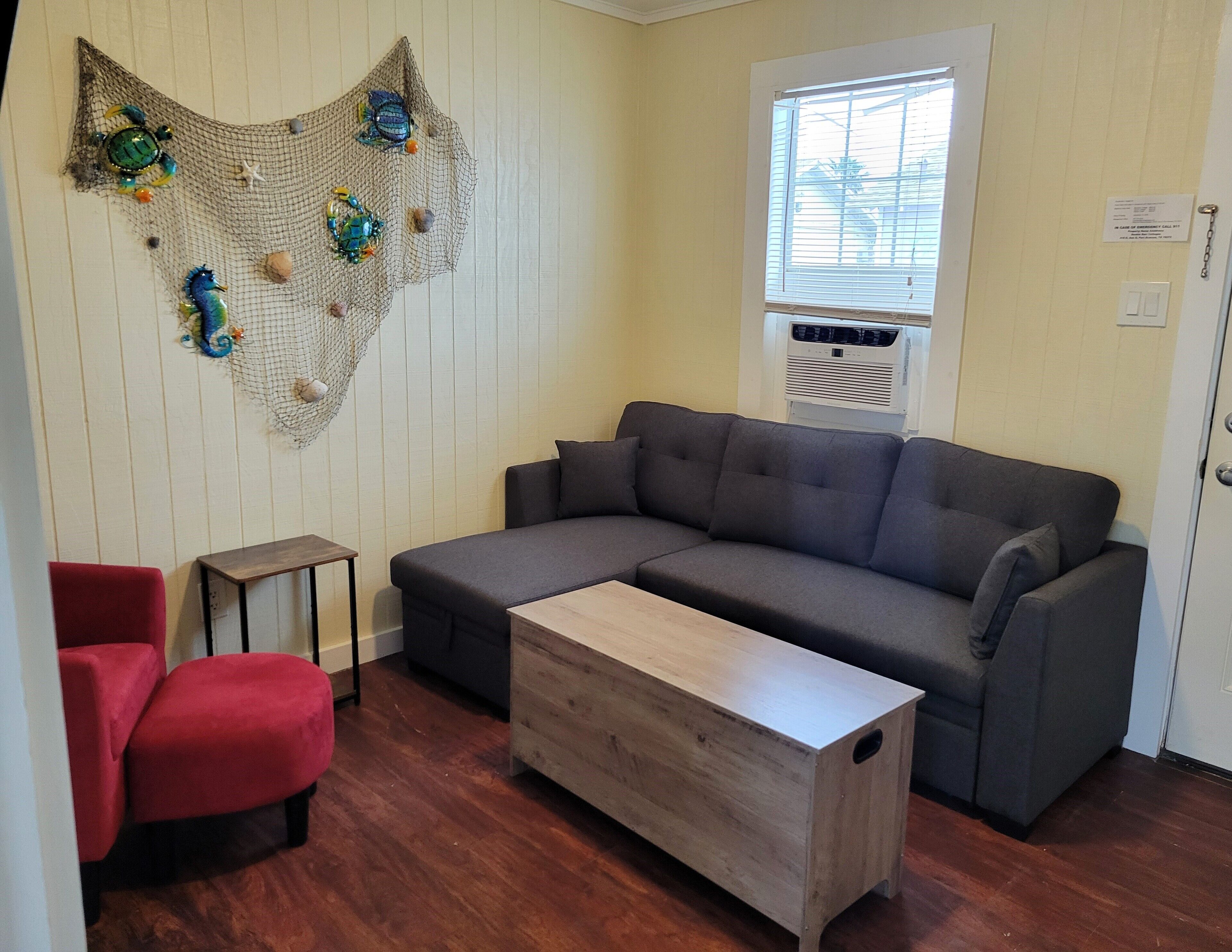 Low Tide now has a separate living area with a sleeper sofa, a coffee table, and additional seating to give you a place to relax and catch a movie after a day at the beach. Whether you're in town for a weekend or several weeks, the living room gives you a comfortable space to watch television, play a game, or read. The couch folds out into a full sized bed to sleep 2 small adults or children. A smart television and wireless internet are included.