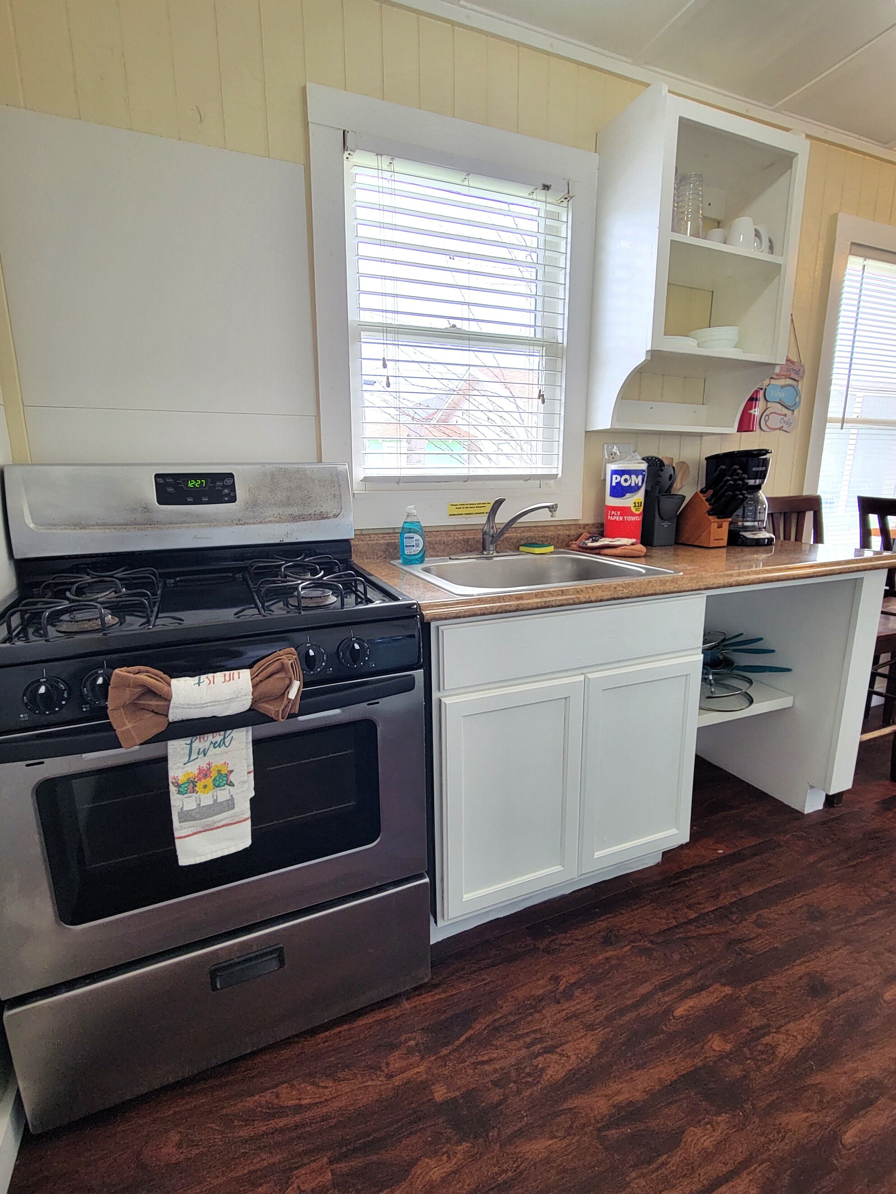 Cottage #9 (Low Tide) has been recently updated with a new configuration and new furnishings. When you enter, you'll find a kitchenette and a dining area that seats four. The main room has a retro vibe that will take you back to the Port A's historic past. The kitchen includes a refrigerator/freezer, gas stove, microwave, a coffee station, and all of the kitchen basics. While we supply pots, pans, dishes and utensils, we do not supply any reusable basics such a oil, spices, or condiments for safety concerns.