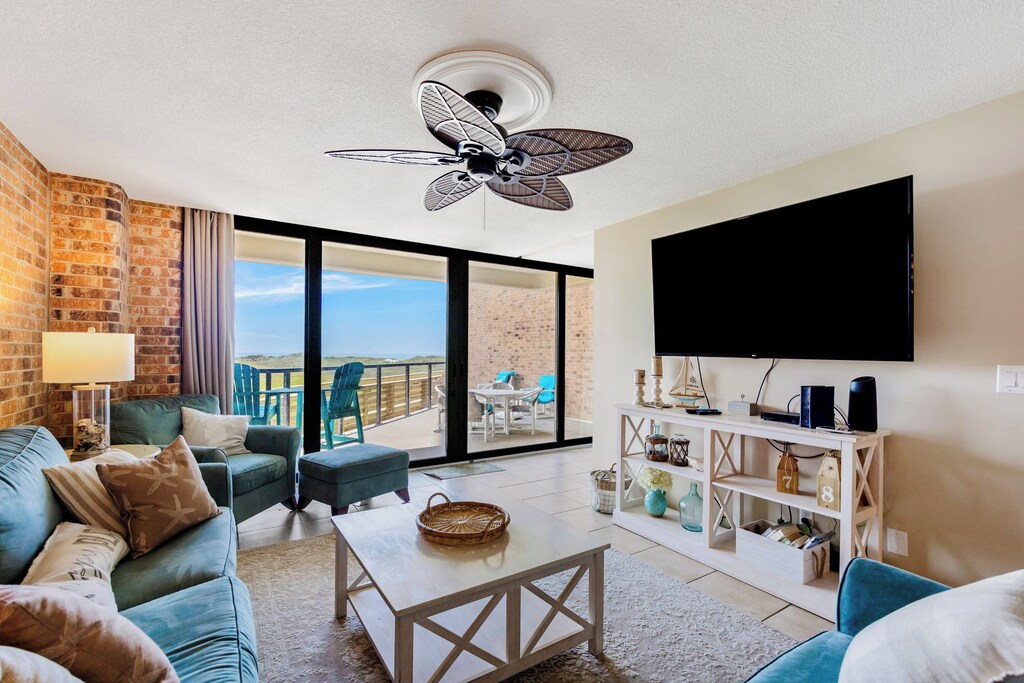 When you enter Wave Watcher, you're greeting by a stunning view of the Gulf through the window wall in the living room. The spacious living and dining areas are a great place for games, a movie, or just to relax after a day of fun in the sun. The dining table seats 6 and there is a small breakfast bar that seats two additional guests. The living room has a large smart television with cable television and internet streaming options. There is a full sleeper sofa to accommodate additional guests. Wireless internet is included with your stay.