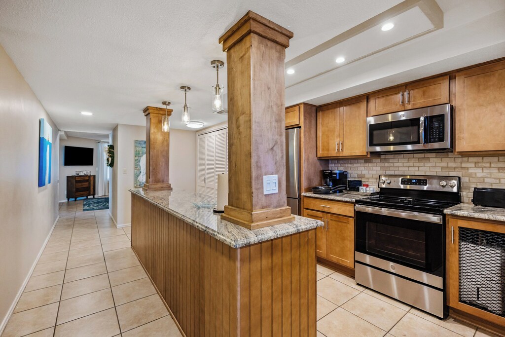 Down the hall, you'll find the full kitchen with granite counters, stainless appliances, and plenty of room to cook the catch-of-the-day. Appliances include a refrigerator, electric range, microwave, dishwasher, Keurig and drip coffeemakers, and other small appliances. Basic cookware, kitchenware, soaps, and paper products are included. There is also a laundry closet with a full size washer and dryer.